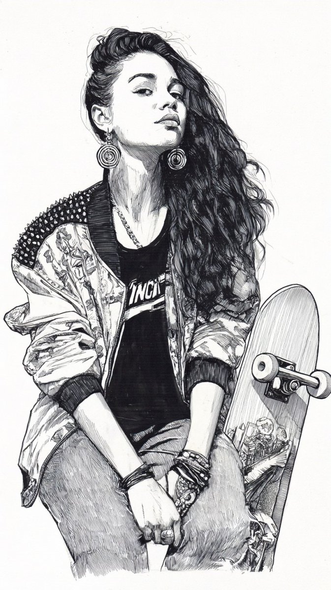 #1. illustration, ink drawing, posing in black leather jacket with silver studs, neon colors, wearing black crop top and ripped jeans, stylish earrings, with long vibrant red hair cascading over shoulders, holding a skateboard, confident expression, urban background. #role_fashion_model