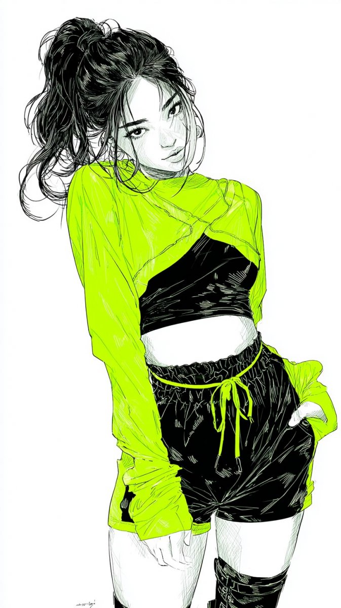#3. illustration, ink drawing, charm girl, wearing black and neon green two-piece outfit with cropped top and high-waisted pants, black ankle boots, long dark hair in ponytail, playful expression, bg is white, #role_fashion_model