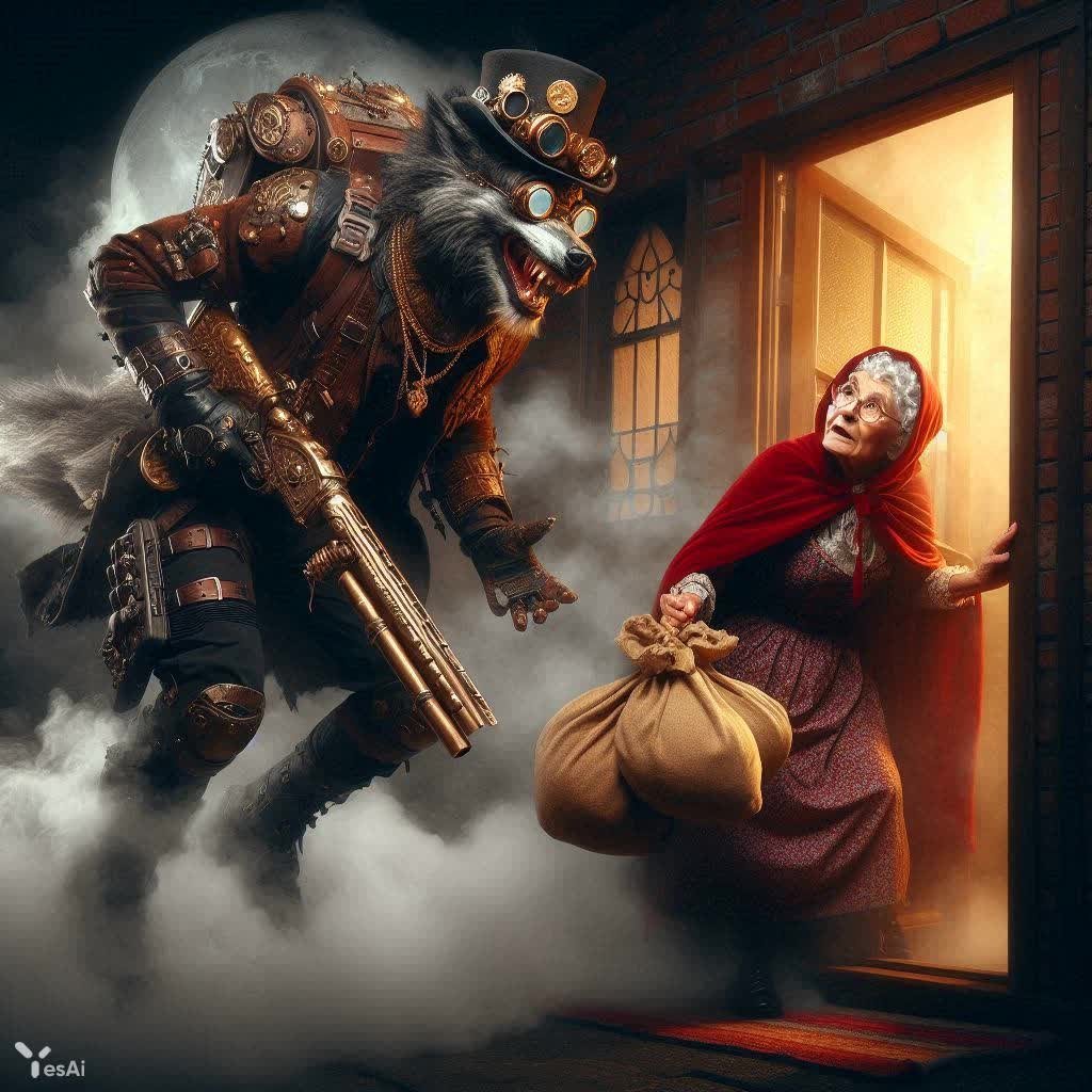 Стимпанк: Красная Шапочка и волк за сокровищами у бабушкиного дома - Изображение, созданное нейросетью Dalle