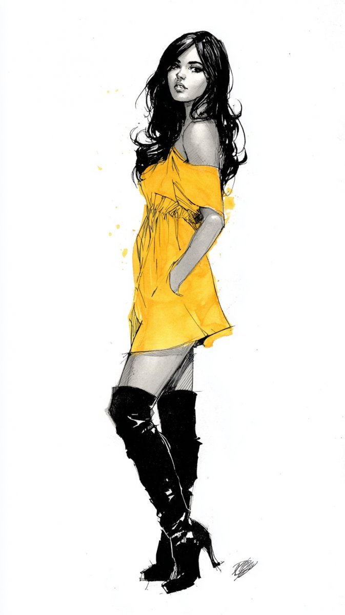 #5. illustration, ink drawing, knockout, posing in a shimmering gold dress with a square neckline and fitted silhouette, black high-heeled boots, long brunette hair styled in waves, looking directly at camera with a fierce expression, bg is plain white. #role_fashion_model