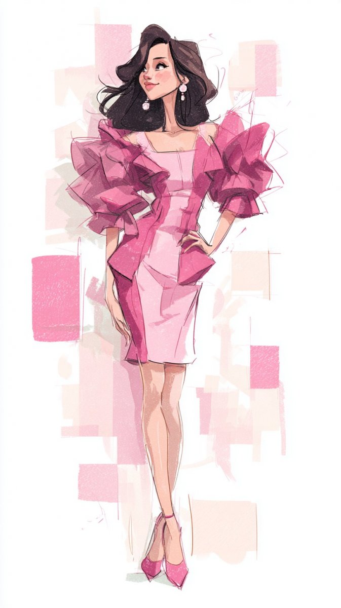 #1. illustration, ink drawing, stunner girl, posing in vibrant pink dress with ruffled sleeves, matching pink high heels, long flowing hair styled in loose waves, bright background featuring abstract shapes, stylish and confident vibe. #role_fashion_model