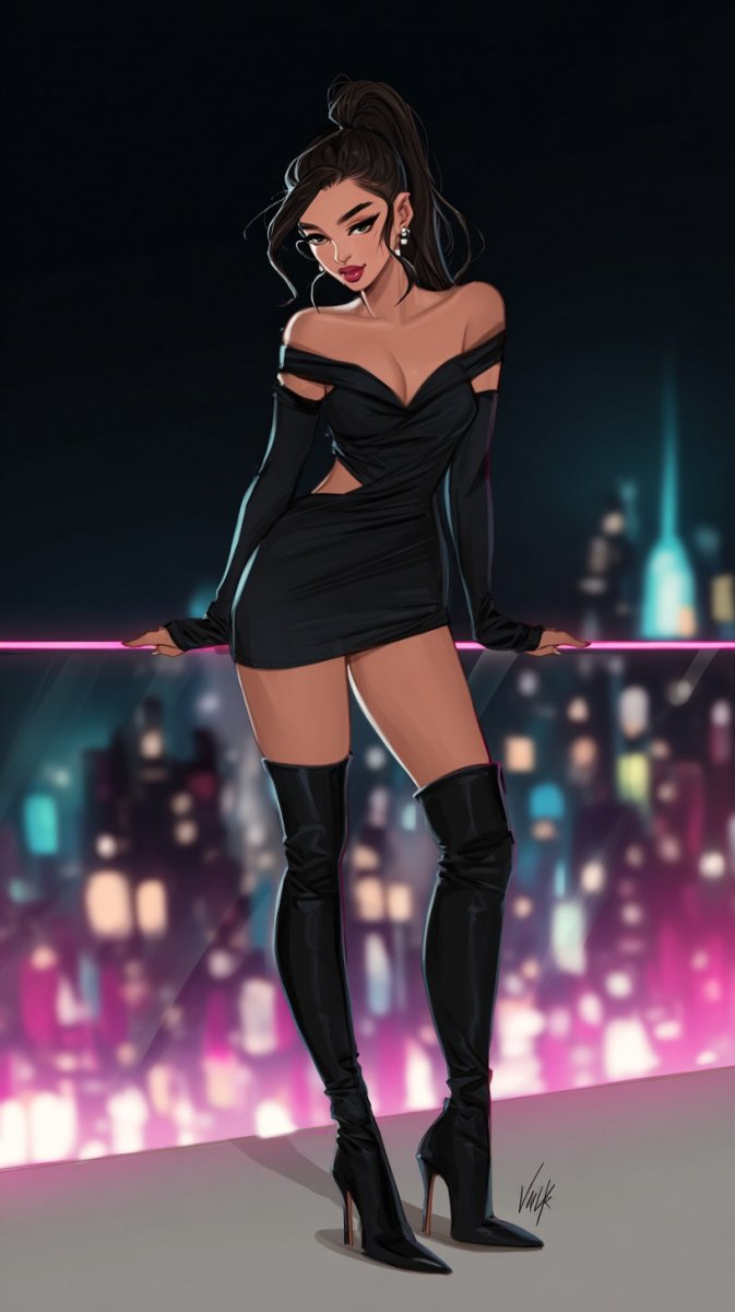 #3. illustration, ink drawing, vixen, wearing a daring black leather outfit with cut-outs, high-waisted pants, stiletto boots, long dark hair in a sleek ponytail, bold makeup, urban cityscape background at night with neon lights. #role_fashion_model