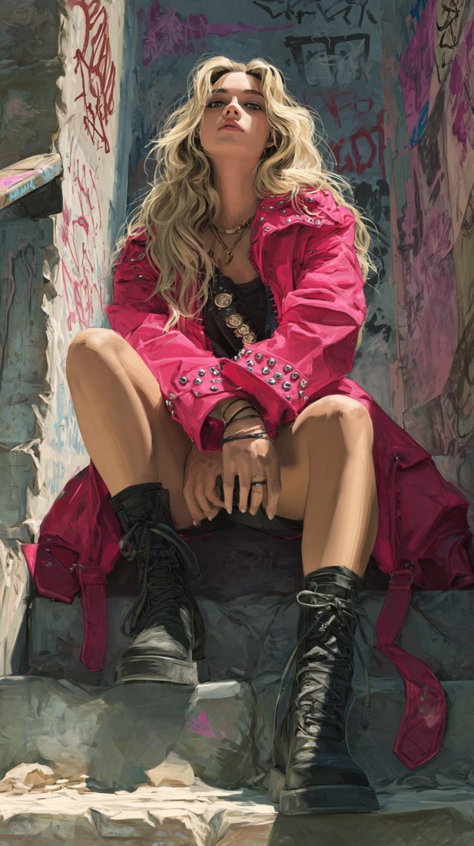 #1. illustration, ink drawing, goddess, wearing bright pink leather jacket with studs and high-waisted leather pants, black ankle boots, long blonde hair styled in loose waves, confident expression, bg is urban alleyway filled with graffiti, bold and edgy vibe. #role_fashion_model