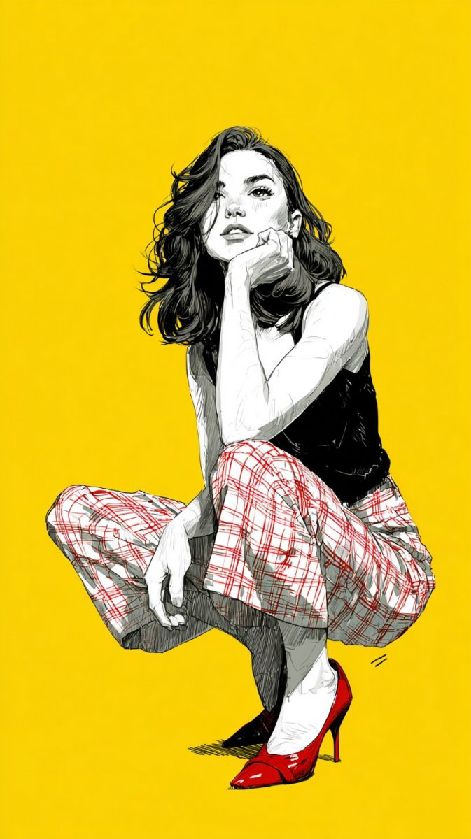 #4. illustration, ink drawing, knockout, posing in a black crop top and high-waisted checkered trousers, chunky white platform shoes, long brunette hair styled in beachy waves, looking confidently at the camera, bg is bright yellow, energetic and modern feel. #role_fashion_model
