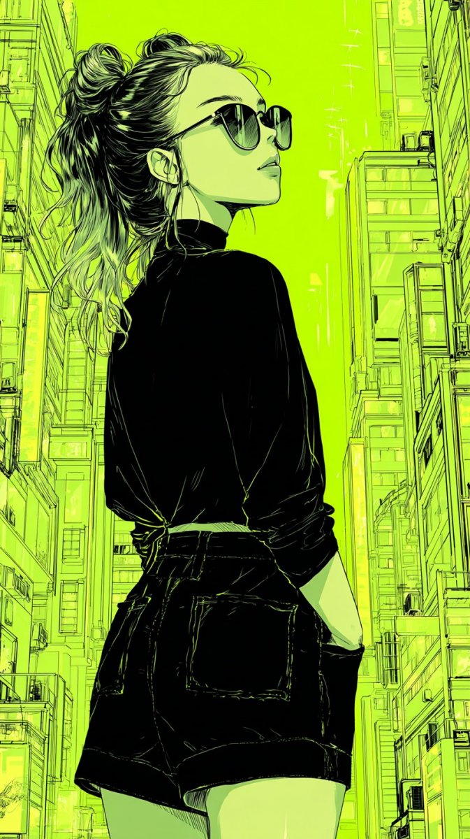 Ее наряд – смелое сочетание высокой моды и уличной эстетики: высокие черные шорты контрастируют с неоново-зеленым кроп-топом, что создает энергичный акцент. Фон картины намекает на оживленную городскую среду с высотными зданиями, подчеркивая динамичность и свободу духа. Вся композиция излучает уверенность, современность и безупречный вкус, воплощая самые актуальные модные тенденции.