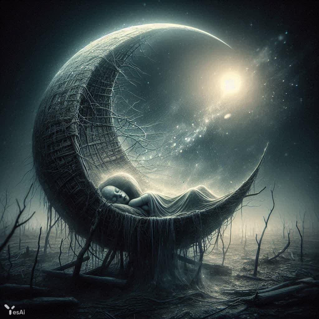 Затерянный в лунном свете, этот образ повествует о хрупкости жизни и неизбежности утрат. Бледный ребенок, словно цветок, выросший среди камней, находит утешение лишь в простом колыбельке из веток, его слезы отражают боль и отчаяние. Над ним висит тонкая полоска нового месяца, свидетельствуя о цикличности времени и переменчивости судьбы. Тьма поглощает ромскую женщину, ее исчезновение предвещает скорбь и одиночество. Внезапный проблеск стали, словно удар молнии, нарушает тишину и символизирует жестокость мира. Атмосфера пропитана чувством заброшенности и горечи, а приглушенные оттенки серебра и глубокого синего лишь усиливают ощущение печали и меланхолии. Художественный стиль напоминает работы Альфонса Мухи, сочетая в себе изысканную красоту и мистическую глубину. В этом полотне переплетаются мотивы древних сказок и потусторонних сил, создавая завораживающую и одновременно тревожную картину, наполненную скрытым смыслом и символическими образами. Это размышление о бренности бытия, о связи человека с природой и о вечной борьбе света и тьмы. Картина пробуждает в зрителе чувство сострадания и заставляет задуматься о хрупкости человеческого существования перед лицом неизбежных перемен
