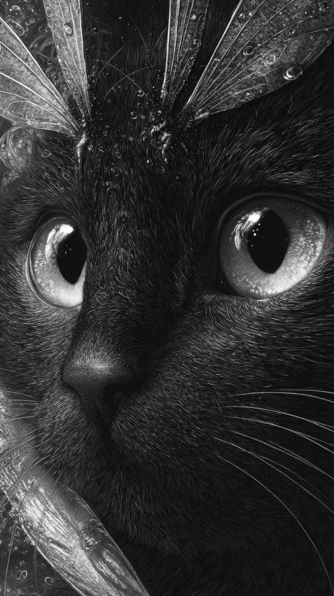 На огромном черном коте, словно на мягком облаке, мирно спит маленькая фея. Это завораживающая картина в стиле фэнтези, выполненная с невероятной детализацией и реализмом в формате 4K. Перед зрителем предстает портрет крошечной волшебницы, спящей на пушистом животе кота. Шерсть кота – абсолютно черная, блестящая, словно бархат, а его глаза – большие, глубокие и сияющие. Картина передает ощущение покоя и умиротворения, будто время замерло в этой волшебной сцене. Изображение выполнено в ультрареалистичном стиле, вдохновленном работами таких мастеров цифрового искусства, как Бипл и Джереми Кетнер. Каждый элемент тщательно проработан: от мельчайших деталей крыльев феи до текстуры шерсти кота. Это поистине потрясающий пример гиперреализма в фэнтезийном искусстве, демонстрирующий невероятное мастерство художника и его умение создавать иллюзию реальности. Невероятно детализированный портрет маленькой феи, отдыхающей на пушистом животe черного кота, вызывает ощущение сказочного сна и погружает зрителя в мир фантазии. Черный кот выглядит очень мягким и уютным, а фея кажется беззащитной и хрупкой, что создает трогательную и запоминающуюся композицию. Эта картина – настоящее произведение искусства, которое заставляет задуматься о красоте и волшебстве окружающего мира