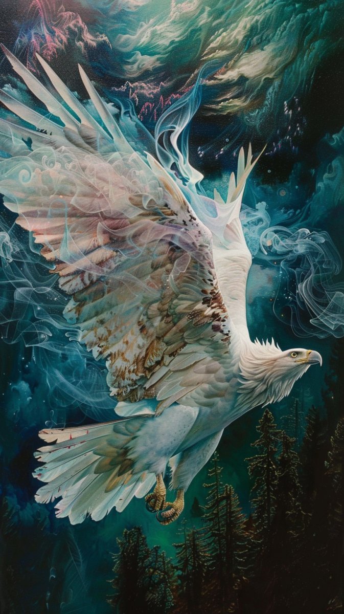 Завораживающее зрелище – белый орел, сотканный из дыма, взмывает ввысь прямо из гигантского полотна. Картина установлена на мольберте посреди таинственного леса, создавая ощущение нереальности происходящего. Дым, принимающий форму могучих крыльев, символизирует освобождение и полет духа. Изображение выполнено в анимационном трехмерном стиле с использованием прозрачного неонового свечения, что придает ему сказочность и футуристичность. Фоном служит волшебный лес, окутанный дымкой тайны, переходящий в космическое пространство – двойная экспозиция создает эффект глубокой перспективы и многослойности. Техника исполнения напоминает живопись маслом с добавлением мистических и даже немного жутковатых элементов. Вся композиция пронизана атмосферой загадочности и тревоги, заставляя зрителя задуматься о границах реальности и воображения. Это не просто изображение – это портал в другой мир, где искусство оживает и обретает крылья. Белый орел из дыма является метафорой надежды и возрождения, а окружающий пейзаж подчеркивает его связь с природой и космосом. Картина словно дышит собственной жизнью, маня зрителя в глубины своего сюжета