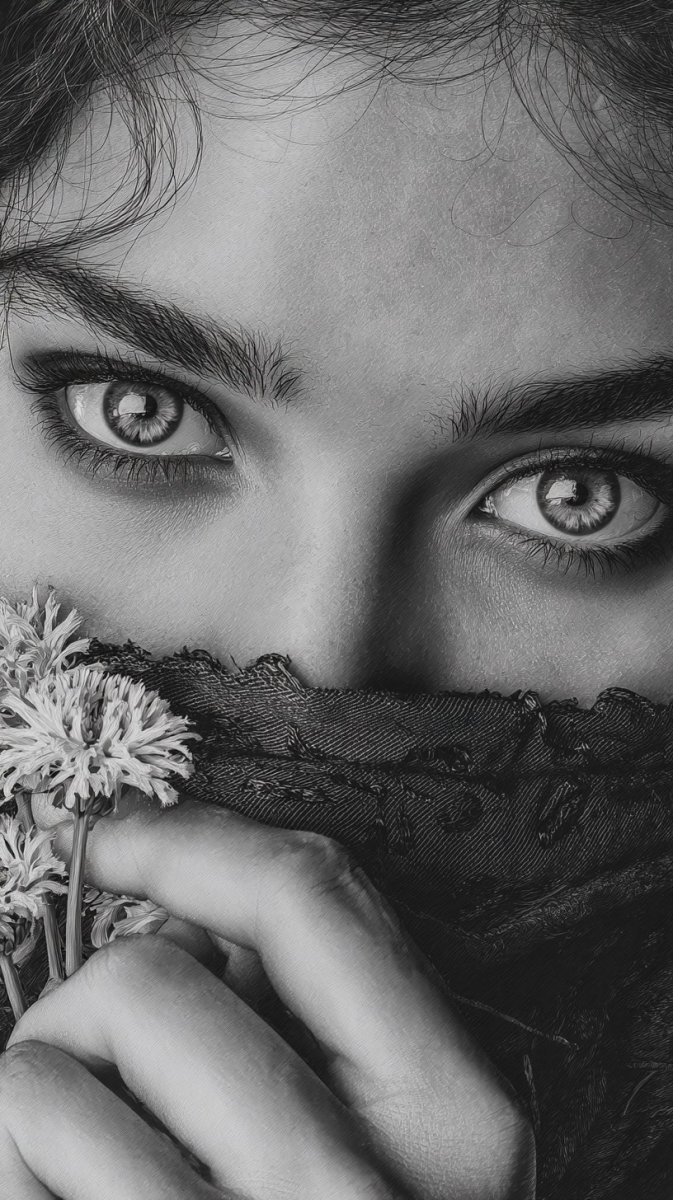 Загадочный портрет в черно-белой гамме завораживает своей контрастностью и глубиной. Вблизи запечатлено лицо девушки с выразительными темными зелеными глазами, полными вызова и внутренней силы. Прямой взгляд, словно пронзающий зрителя насквозь, создает ощущение напряженного ожидания. Нежная женская рука бережно удерживает скромный маленький цветок, что придает композиции элемент хрупкости и контраста с силой взгляда. Детализированное изображение подчеркивает уникальность момента, а сюрреалистичный подход к постановке добавляет загадочности и непредсказуемости. Вся картина пронизана атмосферой таинственности и недосказанности, оставляя простор для интерпретации и размышлений о внутреннем мире изображенной девушки. Она словно воплощение противоречий – сила и нежность, вызов и уязвимость, реальность и мечта. Искусность композиции и игра света и тени создают ощущение трехмерности, делая изображение особенно реалистичным и запоминающимся. Этот портрет - это не просто фотография, а скорее поэтическое высказывание, запечатлевшее мгновение красоты и силы духа в неожиданном сочетании с символом хрупкости и надежды. Это визуальная загадка, которая манит к себе и пробуждает воображение, приглашая зрителя погрузиться в мир фантазий и ассоциаций. Идеально подходит для вертикального формата, подчеркивая стройность композиции и акцентируя внимание на выражении лица девушки и ее взгляде