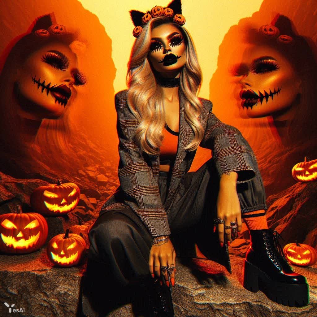 Завораживающая двойная экспозиция создает мистическую атмосферу, где реальность переплетается с фантазией. В центре композиции – силуэт эффектной женщины, воплощающей собой современную красоту и уверенность. Игривые тени и глинч-эффект добавляют изображению глубины и загадочности, а прозрачность пленки словно позволяет заглянуть в другой мир. Яркие акценты хэллоуинского макияжа – оранжевые губы с рисунком тыквы и кошачьи ушки – контрастируют с деловым стилем одежды: обтягивающий топ, пиджак, широкие брюки карго и кроссовки на платформе. Светлые волосы развеваются на ветру, а корона из тыквы добавляет образу некую сказочность. Женщина, украшенная множеством колец и браслетов, сидит на фоне живописного каменистого ущелья в темных тонах, выделяющегося благодаря яркому оранжевому фону. Драматическое освещение и контраст создают кинематографичный эффект, подчеркивая фотореализм и атмосферность снимка. Картина выполнена в современном стиле, сочетая элементы моды, мистики и красоты, пленяя взгляд своей визуальной силой и загадочностью. Это не просто фотография – это история, рассказанная светом и тенью, воплощенная в образе уверенной и стильной женщины