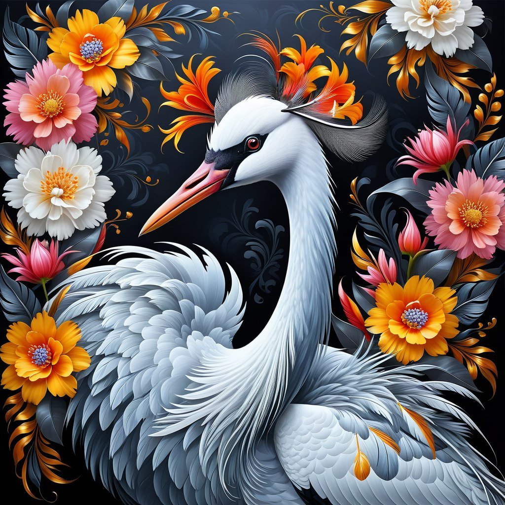 stable diffusion Изящный журавль среди цветочных узоров. Генерация из нейросети Stable Diffusion