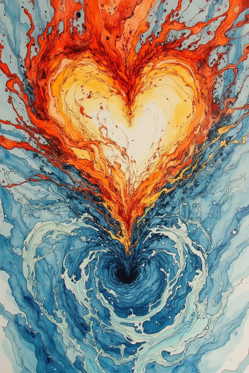 Огонь сердца и круговорот воды: акварель в стиле Донато Джанкаолы - Картинка, полученная с помощью нейросети Flux