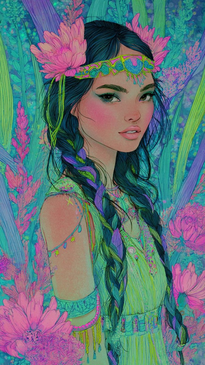 3. ink drawing, illustration, fashion model, charming pixie girl with long flowing hair, wearing a colorful bohemian dress, accessorized with dazzling neon headpieces and bold eye-catching makeup, surrounded by whimsical neon flora. #role_neon_model