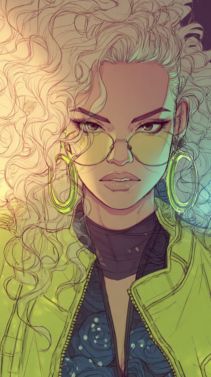 ink drawing, illustration, fashion model, femme fatale girl with big curly long blonde hair, wearing an avantgarde glittery outfit, adorned with neon jewelry and dramatic bold eyeliner, exuding a captivating aura. #role_neon_model