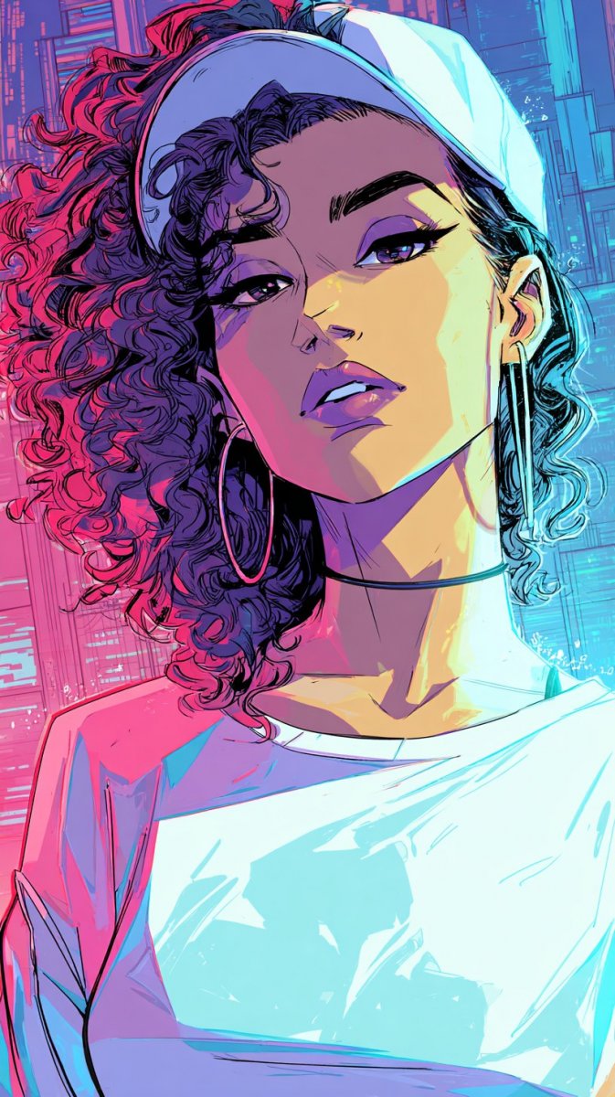 Изображена энергичная городская модель в эффектном неоновом наряде, выполненная в технике туши. Девушка с пышными кудрями, стилизованными под яркую бейсболку, демонстрирует смелый макияж и игривое настроение, уверенно позируя на фоне городского пейзажа. Контраст между насыщенными неоновыми цветами одежды и приглушенными тонами туши создает визуально привлекательный эффект, акцентируя внимание на деталях и динамике композиции. Работа представляет собой заявление о свободе самовыражения и любви к экспериментам со стилем, передающее движение и энергию каждого штриха. Гармоничное сочетание неоновых оттенков с городским фоном формирует яркий образ современной городской модницы, отражающий современную культуру и стремление к индивидуальности. Иллюстрация выполнена в стиле Cyberpunk и NeonPunk нейросетью Midjourney, созданной при помощи Telegram Bot - Yes Ai, по запросу, включающему описание моды, иллюстрацию, модель, девушку с кудрями в бейсболке и неоновый наряд.