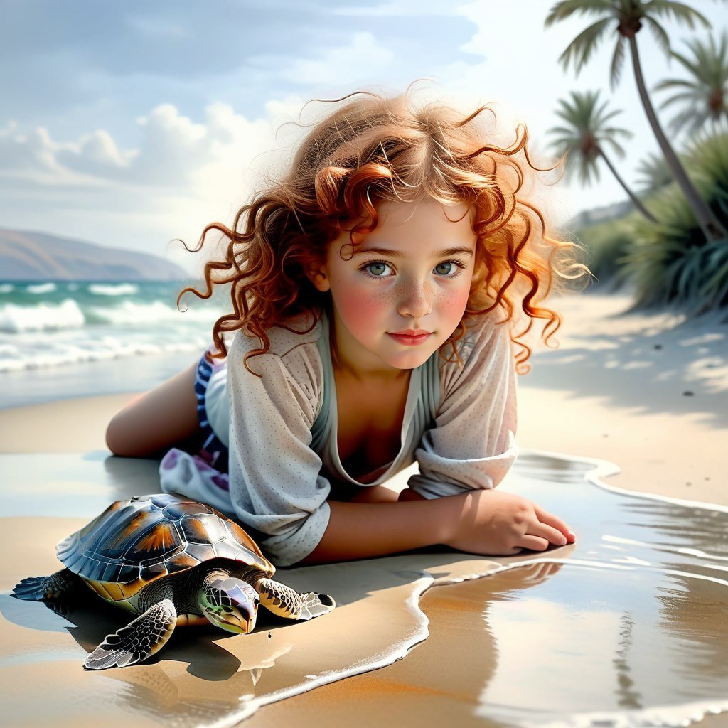 Девочка, лет пяти, рыжие кудрявые волосы развеваются, в стиле художника Уильям Моррис, на берегу моря, пальмы, присела у линии прибоя гладит черепаху в плавательном костюме, нежное серое сфумато, объемный дальный план.