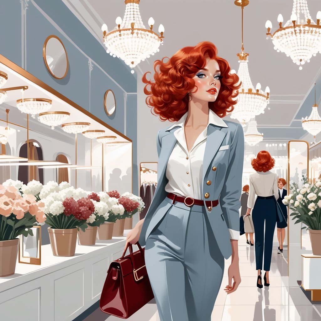 Очаровательная иллюстрация в духе шестидесятых годов переносит нас в атмосферу утонченной элегантности и легкой ностальгии. В центре внимания – девушка с яркими рыжими кудрями, чьи волосы игриво развеваются, создавая ощущение движения и свободы. Ее стильный брючный костюм подчеркивает современный образ, а большая сумка в руках намекает на активную жизнь и приключения. Действие разворачивается в просторном помещении магазина одежды, где отражения в зеркалах, изящные люстры и яркие цветы создают волшебную атмосферу. Белая палитра с акцентами серого, бордового, синего и нежного бежевого придает изображению воздушность и легкость. Свет мягко играет на деталях, подчеркивая художественную ценность иллюстрации. Это произведение искусства – воплощение стиля, красоты и вдохновения, приглашающее зрителя окунуться в мир моды и эстетики прошлых лет. Каждая деталь продумана с любовью к деталям, создавая гармоничное сочетание формы и цвета. Иллюстрация излучает позитив и оптимизм, напоминая о беззаботных временах и красоте простых вещей. Она словно шепчет историю о девушке, уверенной в себе и готовой покорять мир. Это визуальное наслаждение для тех, кто ценит искусство и стиль