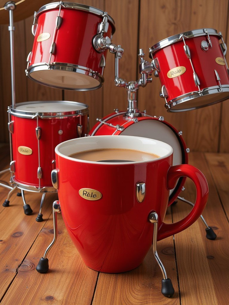 The highly detailed, whimsical still life depicts a bright red drum set artfully integrated with a coffee mug. The body of the mug is designed as a large bass drum, and additional elements of the drum set are represented by smaller drums, cymbals, and stands. The drums are glossy red with silver hardware, creating a high-contrast aesthetic. The inside of the coffee mug is filled with a light brown, creamy liquid resembling coffee or a similar beverage. The mug's handle has a curved, elongated shape that matches the color of the drum set. The drum set is placed on a wooden surface with clearly visible wood grain, adding textural contrast. The ...