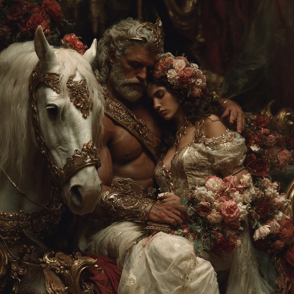 Изысканное полотно, вдохновленное древнегреческой мифологией, переносит зрителя в мир страсти и величия. В центре композиции – объятие могучего мужчины, облаченного в бронзовую корону и роскошные золотые доспехи, и прекрасной женщины в струящемся белом и бирюзовом платье, украшенном золотыми элементами и цветочной гирляндой. Ее закрытые глаза и запрокинутая голова выражают блаженство и полное погружение в момент близости. Окружающий их буйный цветник добавляет картине чувственности и романтичности. На заднем плане величественная золотая колесница, запряженная белыми конями, символизирует божественное происхождение сцены. В ней восседают женщина в золотой короне и платье, а рядом с ней – мудрый старец с длинной бородой, вероятно, олицетворяющий одного из богов Олимпа. Колесница поражает своей детализацией: сложные резные узоры и цветочные мотивы свидетельствуют о высочайшем мастерстве художника. Яркая и насыщенная палитра цветов в сочетании с мягким освещением создает атмосферу мечтательности и неземной красоты, усиленной облачным небом. Средний план позволяет сосредоточиться на паре, подчеркивая их эмоциональную связь. Стиль картины явно отсылает к классическому искусству – высокая детализация, реалистичное изображение фигур и романтическое настроение создают ощущение величия и вечности. Это произведение искусства – ода любви, красоте и мифологическим легендам