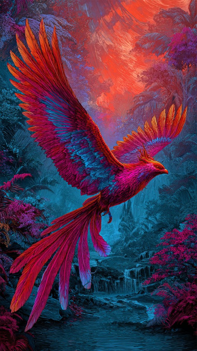 Взмывающий ввысь мифический феникс, воплощенный в захватывающем цифровом искусстве – это зрелище, которое завораживает и вдохновляет. Огненные крылья птицы переливаются всеми оттенками сапфирового синего и рубинового красного, словно живой калейдоскоп энергии и мощи. Он парит над раскинувшимся под ним изумрудным лесом, где мерцающие озера отражают небеса, а древние деревья хранят тайны веков. В глубине чащобы скрываются несметные сокровища, но взгляд приковывают огромные крылья феникса – символ отваги и надежды, развернутые в величественном полете. За фениксом простирается завораживающий пейзаж: плавный переход от яркого оранжевого заката к таинственной синеве сумерек создает неповторимую атмосферу волшебства и величия. Кажется, будто сам закат преклоняется перед этим могущественным существом, а его крылья излучают свет, вселяющий веру в лучшее. Это не просто изображение – это история о возрождении, силе духа и вечной красоте, запечатленная в цифровом формате с невероятной детализацией и художественной выразительностью. Каждое перо, каждый отблеск пламени проработаны с любовью к деталям, создавая ощущение полного погружения в этот сказочный мир. Феникс – это символ преображения, а его крылья – воплощение свободы и стремления к небу