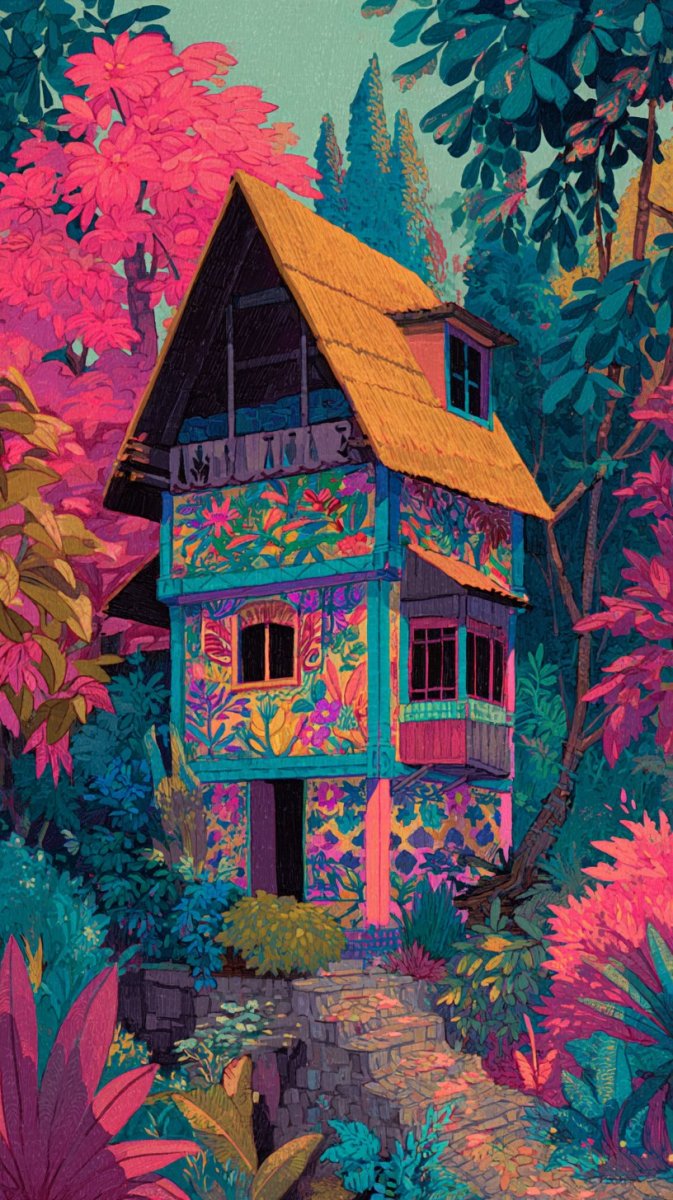 midjourney Яркая деревня: иллюстрации с домиками в наивном стиле и цветочным узором. Генерация из нейросети Midjourney