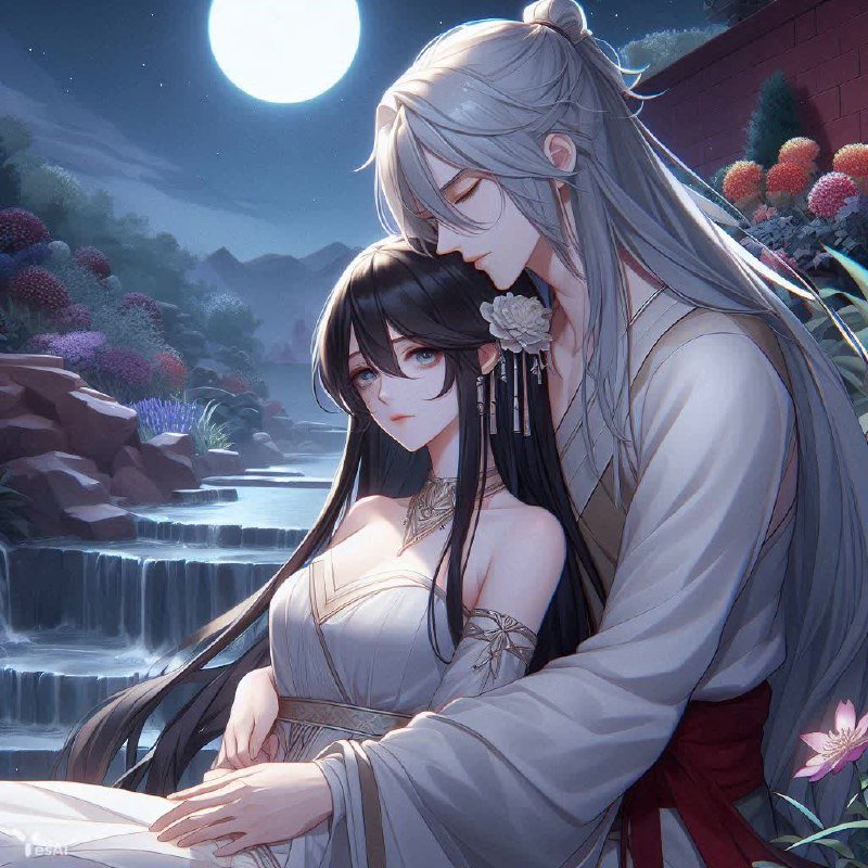 Изящная и дерзкая юная красавица с длинными черными волосами и оливковой кожей, облаченная в легкое, почти невесомое платье, нежно прислоняется к могучему воину. Его белоснежная кожа контрастирует с серебристыми прядями волос, а пронзительные голубые глаза излучают заботу и нежность. Крепкими руками он бережно обнимает свою возлюбленную, создавая ощущение безопасности и безграничной любви. Вокруг царит атмосфера сказочного волшебства: благоухающие цветы, пышные кусты, искусственно созданный водопад и красная каменная стена образуют живописный фон для этой трогательной сцены. Ночное небо украшает огромная луна, заливающая все вокруг мягким, серебристым светом. Вся картина пронизана духом фэнтези, перенося зрителя в мир грез и романтических приключений, где любовь преодолевает любые преграды, а красота природы лишь подчеркивает величие чувств. Эта сцена – воплощение страсти и нежности, запечатленное во времени и пространстве, словно иллюстрация к волшебной сказке о двух любящих сердцах. Вся композиция передает ощущение гармонии и умиротворения, позволяя зрителю ощутить на себе теплоту их объятий и искренность их чувств