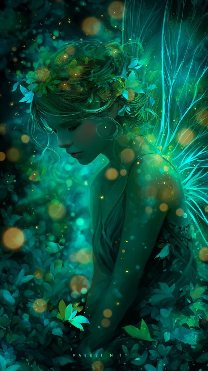 #1. A whimsical digital art piece of an enchanted forest fairy with luminescent wings, her body surrounded by swirling patterns of light, flowers, and sparkling stars. The background transitions from deep green to soft gold, providing a magical aura that enhances her ethereal beauty. She has cascading hair, adorned with tiny glowing orbs, and a serene smile that conveys a sense of peace, focus on her expression. #sp_digital_art