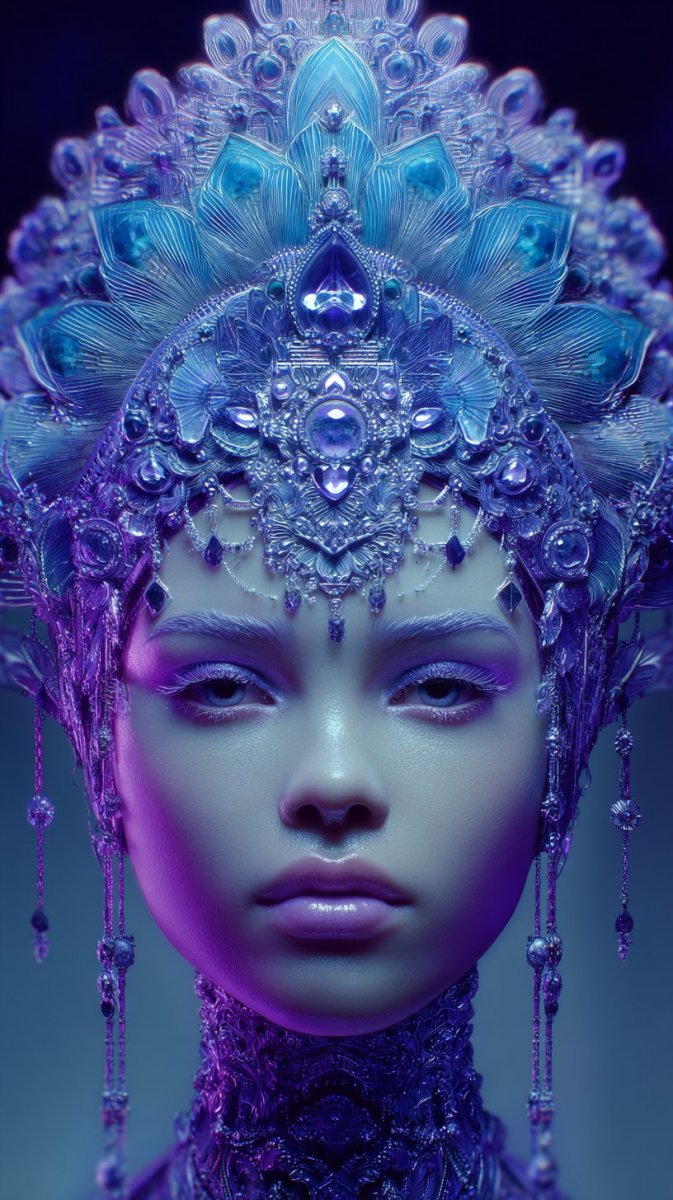 Завораживающий персонаж с оливковой кожей предстает в образе, сотканном из космической красоты и древней мистики. Его лицо украшает потрясающий макияж, напоминающий танцующие туманности – вихри электрического синего и глубокого пурпурного цветов, словно отражающие далекие галактики. Изящная серебряная филигрань, казалось бы, парит над кожей, добавляя образу неземной блеск и легкость. На голове персонажа возвышается великолепный головной убор в форме распускающихся лотосов, символизирующих пробуждение и духовную чистоту. Вся эта волшебная сцена разворачивается на фоне величественных древних руин, окутанных мягким светом луны, создавая атмосферу таинственности и вечности. Искусство цифровой живописи оживает в этом изображении, передавая сложность деталей и глубину эмоций. Это не просто портрет – это окно в другой мир, где встречаются красота человеческого тела и великолепие космоса, где прошлое переплетается с будущим в гармоничном танце света и тени. В каждой линии, в каждом оттенке чувствуется вдохновение и мастерство художника, создавшего этот неповторимый шедевр цифрового искусства. Это изображение – гимн красоте, таинственности и безграничным возможностям воображения