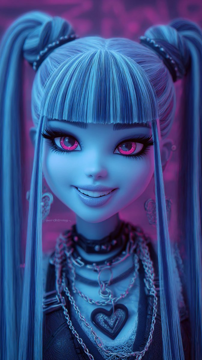 Изысканная кукла Monster High в гиперреалистичном стиле поражает воображение. Её длинные волосы заплетены в косички-хвостики, а милые челочные пряди выполнены в форме сердечек, добавляя образу игривости и очарования. Широкая улыбка открывает ряд острых вампирских клыков, подчеркивая её загадочный характер. Портрет куклы выполнен в полный рост, позволяя рассмотреть все детали роскошного наряда и сверкающих украшений. За глазами мерцают завораживающие красные огни, создающие эффект потусторонней красоты. Стиль изображения – мрачная фэнтези-иллюстрация, добавляющая образу глубины и таинственности. На лице куклы нанесен аккуратный черный лайнер, подчеркивающий выразительность её взгляда. Белоснежная фарфоровая кожа создает контраст с темными элементами образа, делая его еще более привлекательным. Надпись 'witch' намекает на магическую природу этой необыкновенной куклы, добавляя ей загадочности и притягательности. Это произведение цифрового искусства является настоящим шедевром детализации и реализма, способным покорить сердца коллекционеров и любителей всего мистического и прекрасного. Кукла словно сошла со страниц волшебной сказки, воплощая в себе образ могущественной колдуньи с неповторимым шармом и элегантностью