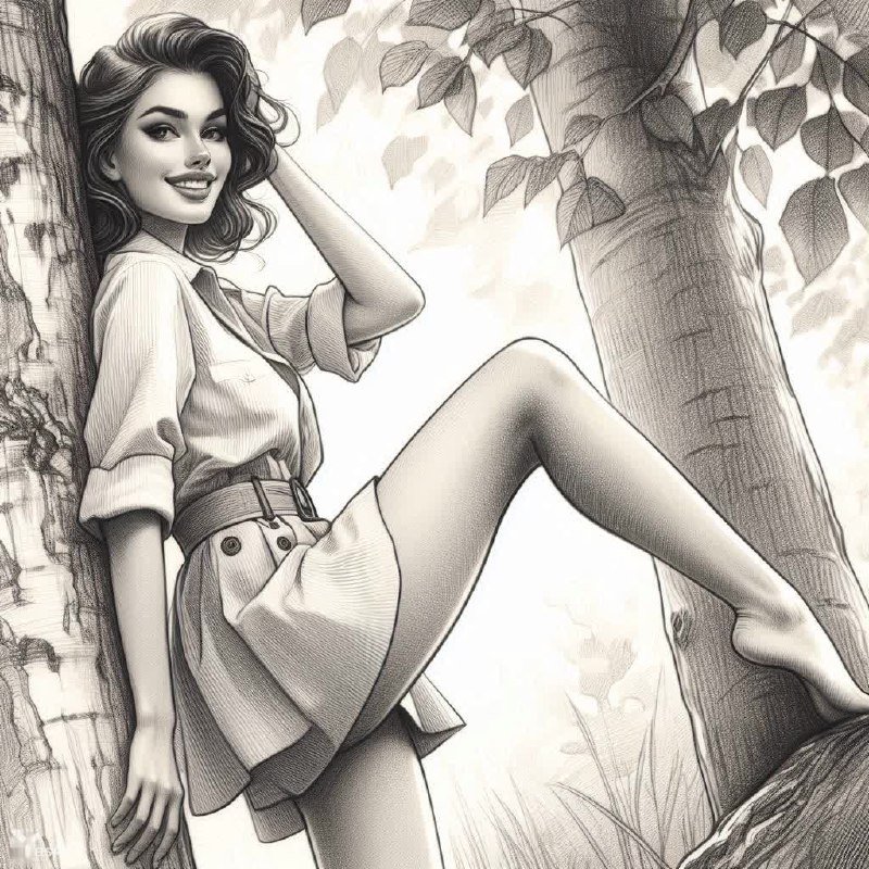 Изящный портрет молодой женщины в объятиях природы, вдохновленный классическими работами художников Альберта Бирштадта, Эндре Пеноваца и Ли Богла. Картина излучает утонченную мечтательность: героиня, опираясь спиной и ногой на могучее дерево, украшает пейзаж своей очаровательной улыбкой. Вдохновленная стилем пин ап, работа выполнена с поразительной детализацией в технике графического карандаша, подчеркивающей тонкость линий и нежность пастельных тонов. Мастерское использование сфумато создает мягкое, рассеянное освещение, а легкий скетч придает изображению живость и непосредственность. Высокая четкость изображения Ultra full HD позволяет рассмотреть каждую деталь: от текстуры коры дерева до бликов света в волосах девушки. Это произведение искусства – ода красоте природы и женственности, воплощенная в изысканной технике рисунка. Картина пленяет своей гармонией и умиротворением, приглашая зрителя погрузиться в атмосферу безмятежной красоты и нежности. Ощущение легкости и воздушности создается благодаря светлым тонам и плавным переходам цвета. Изображение передает ощущение тесной связи между человеком и природой, подчеркивая хрупкость и великолепие окружающего мира. Это визуальное воплощение мечты о гармонии и красоте