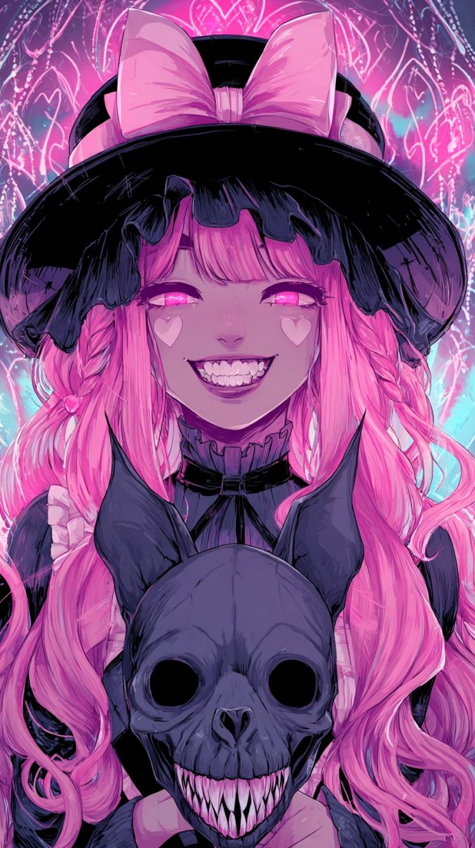 #1. a pink and black illustration of an adorable monster girl with long wavy hair and heart-shaped eyes, dressed in gothic attire, wearing oversized bow hat, posing next to her pet bat that has skull face mask on, smiling with sharp teeth, vivid colors, digital art style, dark shadows around head, #sp_digital_art