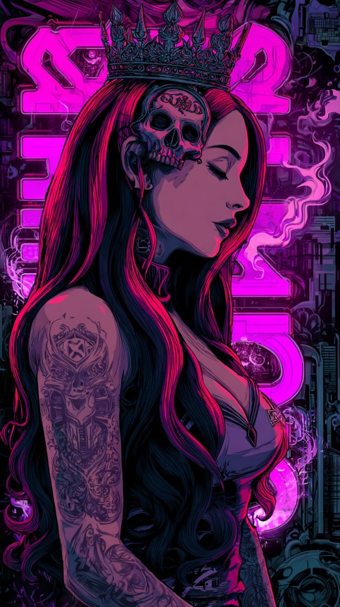 Воплощение готической элегантности и бунтарского духа. Перед зрителем предстает прекрасная принцесса, чье тело украшено сложными татуировками, а длинные волосы сочетают в себе глубокий черный и огненный красный цвета, создавая завораживающий контраст. Она гордо удерживает свою корону, символ власти и благородства, но ее окружает мрачная атмосфера: черепа и клубы дыма намекают на темное прошлое или неизбежную судьбу. Над ней сияет неоновый фиолетовый текст, добавляющий динамизма и современности этой фантастической композиции. Искусство выполнено в ярком готическом цифровом стиле, с использованием насыщенных розовых и белых оттенков для фона, которые подчеркивают драматизм сцены. Мягкое освещение создает игру теней и бликов, придавая изображению глубину и реалистичность. 3D-рендеринг обеспечивает потрясающую детализацию каждого элемента: от текстуры татуировок до блеска короны. Это произведение искусства – не просто портрет, а целая история, рассказанная визуальным языком, сочетающая в себе красоту, силу и загадку. Здесь переплетаются мотивы королевской власти, смерти и возрождения, создавая неповторимую атмосферу мистики и очарования. Вся картина излучает ауру таинственности и притягательности, пленяя взгляд и заставляя задуматься о скрытых смыслах, заключенных в этом готическом шедевре