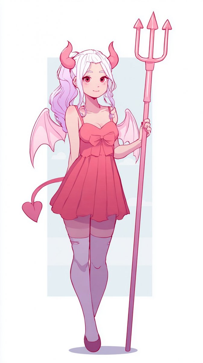 #2. a cartoonish full-body illustration of a cute demon girl with pastel hair and angel wings, dressed as lilith from satan's little helper, her eyes have an evil look on her face, wearing a red dress and holds a pitchfork, pink clouds, white sky, bright lighting over shoulders, #sp_digital_art