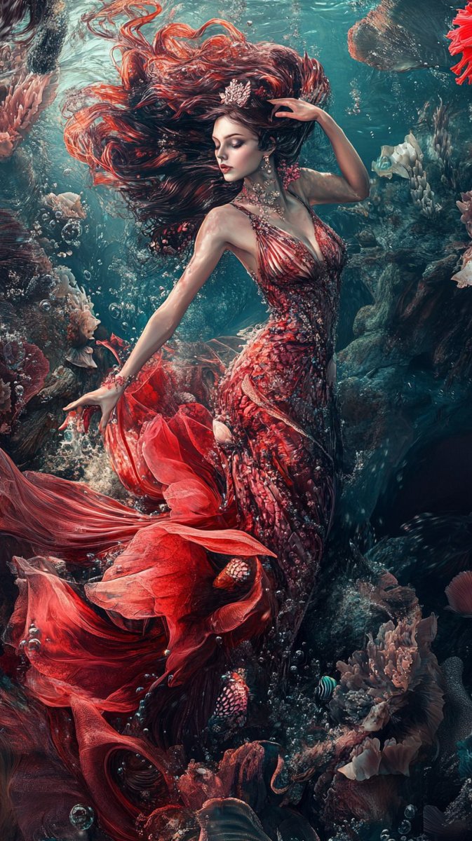 A striking mermaid with flowing hair, adorned in an elegant gown made of cascading ocean waves and delicate seashells, gracefully dancing with the current. She is surrounded by vivid coral reefs and shimmering seaweed in a fantasy art style. This fantastic concept art features intricate details and vibrant colors, created using digital art technology. The portrait is designed with a spiritual aura, evoking a serene and mystical underwater realm, capturing attention on Artstation, CGS Society, and ZBrush Central. --ar 9:16 --v 6.1