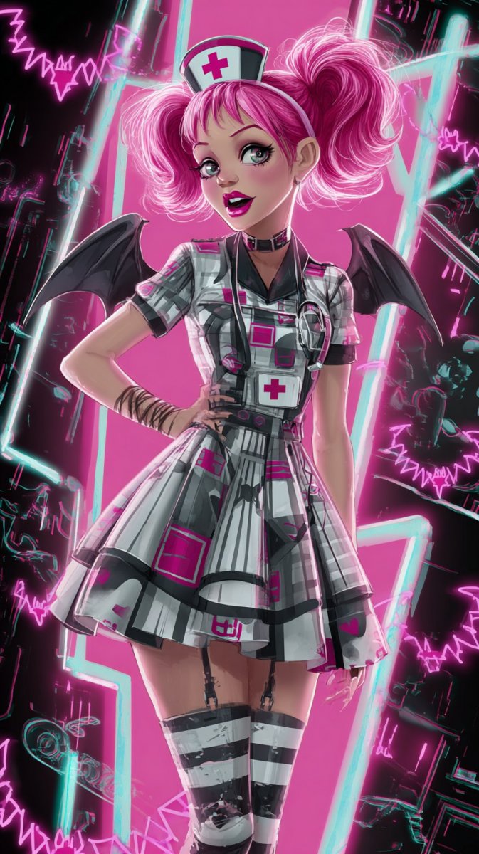 Завораживающий портрет готической медсестры в ярких тонах. Эта девушка – воплощение мистической красоты и очарования, вдохновленное эстетикой Monster High. Ее нежно-розовые волосы контрастируют с мрачным готическим макияжем, подчеркивающим выразительные черты лица. Она одета в милый полосатый наряд и униформу медсестры с узором, напоминающим клетку, что создает уникальный образ. Романтическая сцена оживает благодаря яркому освещению и полету летучих мышей вокруг нее, добавляя атмосферу загадочности и волшебства. Цифровое искусство демонстрирует детализированный полный портрет, передающий характер и индивидуальность персонажа. Каждая деталь тщательно проработана, от текстуры ткани до выражения лица, создавая неповторимую визуальную историю. Этот образ – идеальное сочетание милоты, готики и фантазии, привлекающее внимание своей необычностью и ярким стилем. Это цифровое произведение искусства излучает романтику и таинственность, приглашая зрителя окунуться в мир темной красоты и сказочных персонажей. Яркие цвета и детализированная прорисовка создают ощущение реалистичности и погружают в атмосферу волшебства. Она выглядит как ожившая кукла из мира Monster High, готовая к приключениям и тайнам