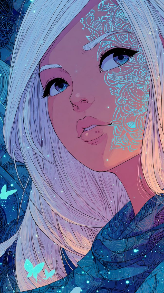 Очаровательная волшебница с ниспадающими локонами сияющего серебра, чье лицо украшено сложными небесными узорами, произносит заклинание под полной луной. Ее магическое действо происходит в окружении мерцающих фей и неземного света, которые подчеркивают ее загадочную привлекательность и мистическую ауру. Вся сцена пронизана волшебством и таинственностью, создавая впечатление сказочного мира, где сбываются самые невероятные мечты. Образ девушки воплощает собой красоту, мудрость и силу магии, являясь символом надежды и вдохновения для всех, кто верит в чудеса. Это визуальное представление очарования и волшебства, переплетенное со звездным светом, дарит зрителю ощущение чуда и погружает в мир фантазий. Изображение излучает спокойствие и гармонию, при этом сохраняя элемент таинственности, что делает его поистине завораживающим. Эта девушка - не просто волшебница, она хранительница древних знаний и проводник в неизведанные миры. Она словно соткана из лунного света и звездной пыли, обладая несравненной красотой и силой