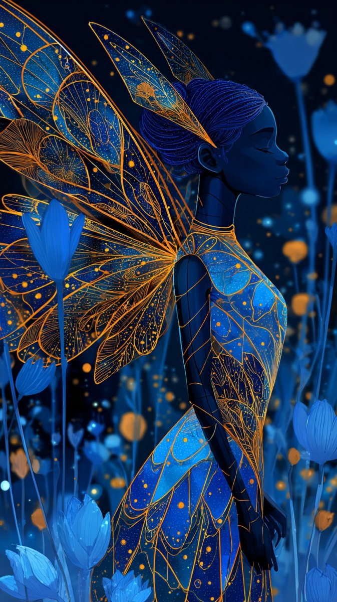#2. a dazzling stunner girl adorned with intricate butterfly wings of vivid blue and golden colors, their patterns glowing against the darkness, as they showcase ethereal make-up art that dances with trails of light, set in a magical garden of luminous flora. #sp_girl