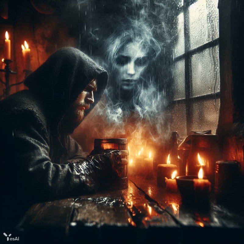 В полумраке старинной таверны одинокая фигура, вероятно палач, погружена в глубокую скорбь. Его лицо выражает неизбывную печаль и отчаяние, подчеркнутые отражениями дождя на запотевшем окне и мерцанием свечей. За спиной словно появляется призрачный образ молодой женщины, охваченной пламенем – болезненное воспоминание о потерянной любви, омрачающее его существование. Атмосфера усиливается вихрями дыма и тлеющими углями, создавая ощущение тоски и сожаления, а контраст между густой тьмой и ускользающими образами подчеркивает глубину душевной боли. Изображение пронизано средневековым духом, с грубой деревянной текстурой и приглушенной цветовой гаммой, где яркие вспышки оранжевого и красного акцентируют драматизм сцены. Стиль художника Брома передает эмоциональную насыщенность, погружая зрителя в мрачную фантазию, полную деталей и предчувствия беды. Картина повествует о потерях, возможно искуплении и тяжелом бремени прошлого, запечатленном в момент отчаяния и безысходности – это визуальная история человеческой трагедии, где боль и память переплетаются, оставляя глубокий след в душе наблюдателя. Искусственный интеллект DALLE-3 сгенерировал изображение на основе запроса, описывающего одинокую фигуру в тени, таверну, отражения света, печальное выражение лица, призрачный образ женщины в огне и атмосферу тоски, выполненное в стиле Брома для создания темного, детализированного и эмоционально насыщенного произведения.