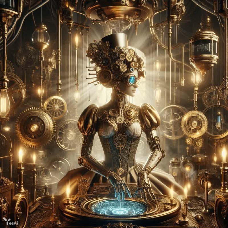 Загадочное создание из эпохи пара и механизмов – сложный автоматический механизм в образе женщины, воплощающий собой пик викторианской изобретательности. В полумраке лаборатории, пропитанной духом научных открытий, демонстрируется поразительная конструкция: видимые латунные шестерни, замысловатые трубы и светящиеся энергетические каналы переплетаются в сложную систему, оживляемую идеально синхронизированным движением. Детализация поражает воображение – от полированных металлических поверхностей до мельчайших механических компонентов, каждый элемент проработан с невероятной точностью. Эстетика дарем академии дополняется элементами ар-деко и изящными филигранными узорами, создавая атмосферу тайны и предвкушения открытия. Драматическое освещение подчеркивает глубину теней, а лучи света проникают сквозь клубы пара, добавляя сцене кинематографичности. Лицо женщины, обрамленное сложной механической конструкцией, выражает меланхолию и загадочность. Искры, вылетающие из механических соединений, лишь усиливают ощущение живого, дышащего механизма. Эта высокодетализированная сцена, выполненная в разрешении 8k с использованием передовых технологий рендеринга, таких как глобальное освещение и трассировка лучей, представляет собой настоящее произведение искусства, сочетающее в себе научную фантастику, викторианскую эстетику и мастерство исполнения. Цветовая палитра бронзы, меди и глубоких синих оттенков создает утонченную и притягательную атмосферу, заставляющую зрителя погрузиться в мир сложной механики и скрытых тайн