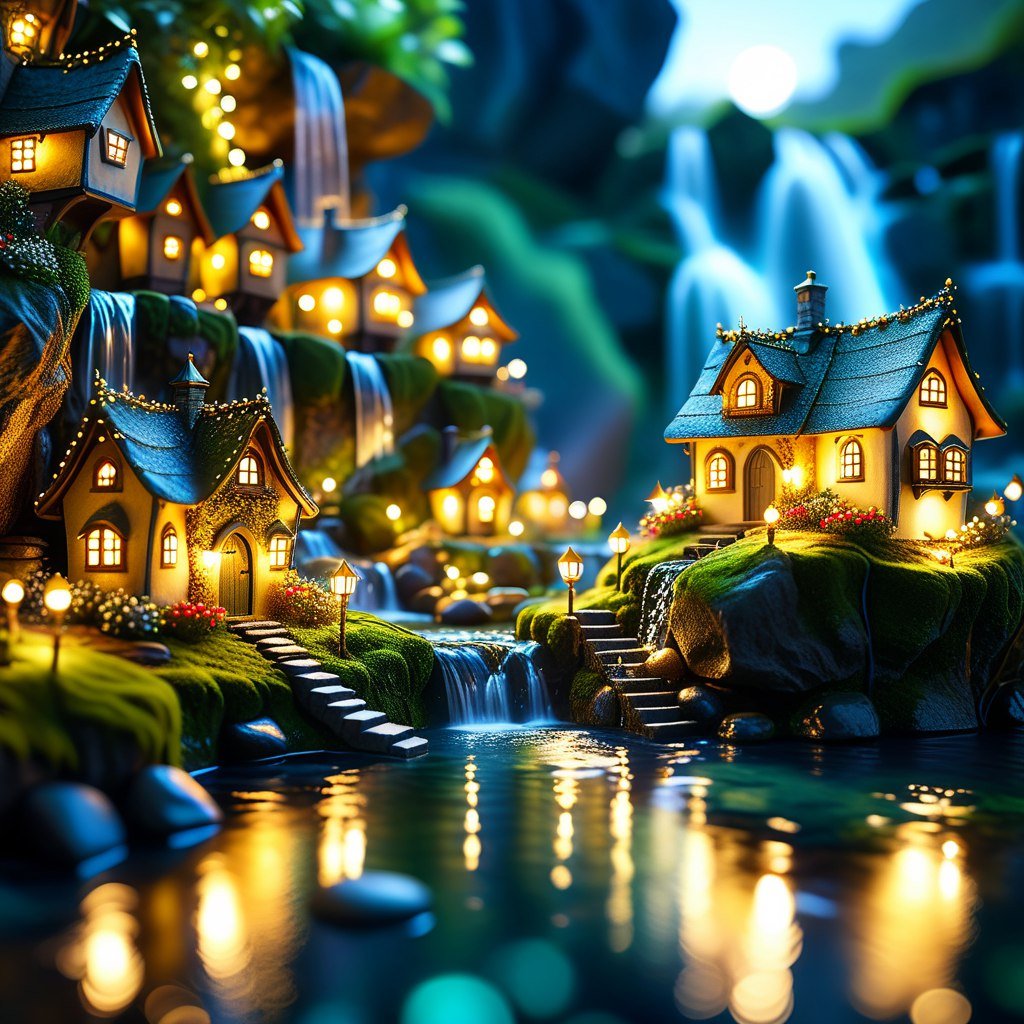 Magical miniature fairy village perched on a mossy cliff edge, with tiny stone cottages adorned in glowing golden fairy lights. A delicate waterfall cascades from the cliff into a shimmering pool below, surrounded by lush greenery and twinkling bokeh lights. Soft, dreamy atmosphere with cinematic lighting, shallow depth of field, and ethereal glow. Highly detailed, fantasy art style, enchanting nighttime scene, whimsical and serene. Rendered in photorealistic quality with rich textures, water reflections, and warm ambient illumination