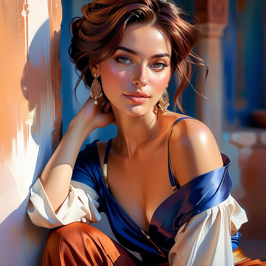 impressionism, light palette, light strokes of paint, sketch. dynamic pose, cute nose, high chin line, angular cheeks, shy smile, mahogany hair, slicked back, palazzo pants, eroticbronze Moroccan top, rich sapphire and pastel sandstone colors, wide view, sharp focus, complex details, high detail.