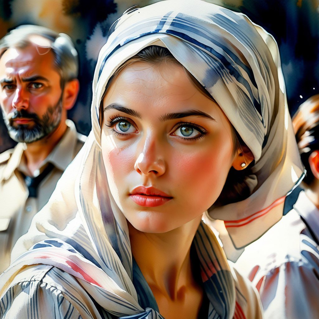 Watercolor acrylic random pose of a focused young Soviet woman in a light-colored headscarf and a medical-style shirt, staring intently ahead. Her expressive eyes reflect determination, and the soft lighting enhances the features of her face. In the background, several slightly blurred figures can be seen, including a man in a striped shirt, adding depth to the scene. The black-and-white image enhances the atmosphere of seriousness and contemplation.