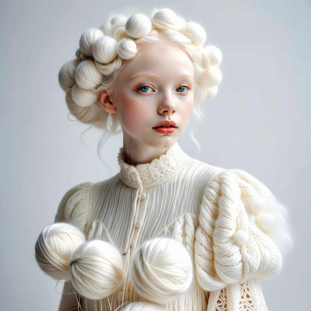 Невероятная нежность и воздушность в образе хрупкой альбиноски на фоне чистого белого пространства. Изысканный ансамбль из хлопка и пуха создает ощущение легкости и эфемерности, словно персонаж соткан из облаков. Вместо волос – огромные клубки белоснежной нити, добавляющие образу сюрреалистичности и сказочной наивности. Грациозная фигура подчеркнута плавными линиями платья, выполненного в технике fluid art, что создает эффект текучести и невесомости. Высокая мода встречается с детской непосредственностью, рождая уникальное сочетание невинности и элегантности. Этот образ – воплощение чистоты и света, вдохновленный миром грез и фантазий. Легкость и воздушность создают ощущение полета, а деликатная цветовая гамма усиливает впечатление нежности и хрупкости. Фотография передает атмосферу волшебства и утонченности, представляя собой настоящее произведение искусства в сфере моды и фотографии. Эта работа демонстрирует новаторский подход к созданию образов, сочетая в себе элементы высокой моды, современного искусства и сказочных мотивов