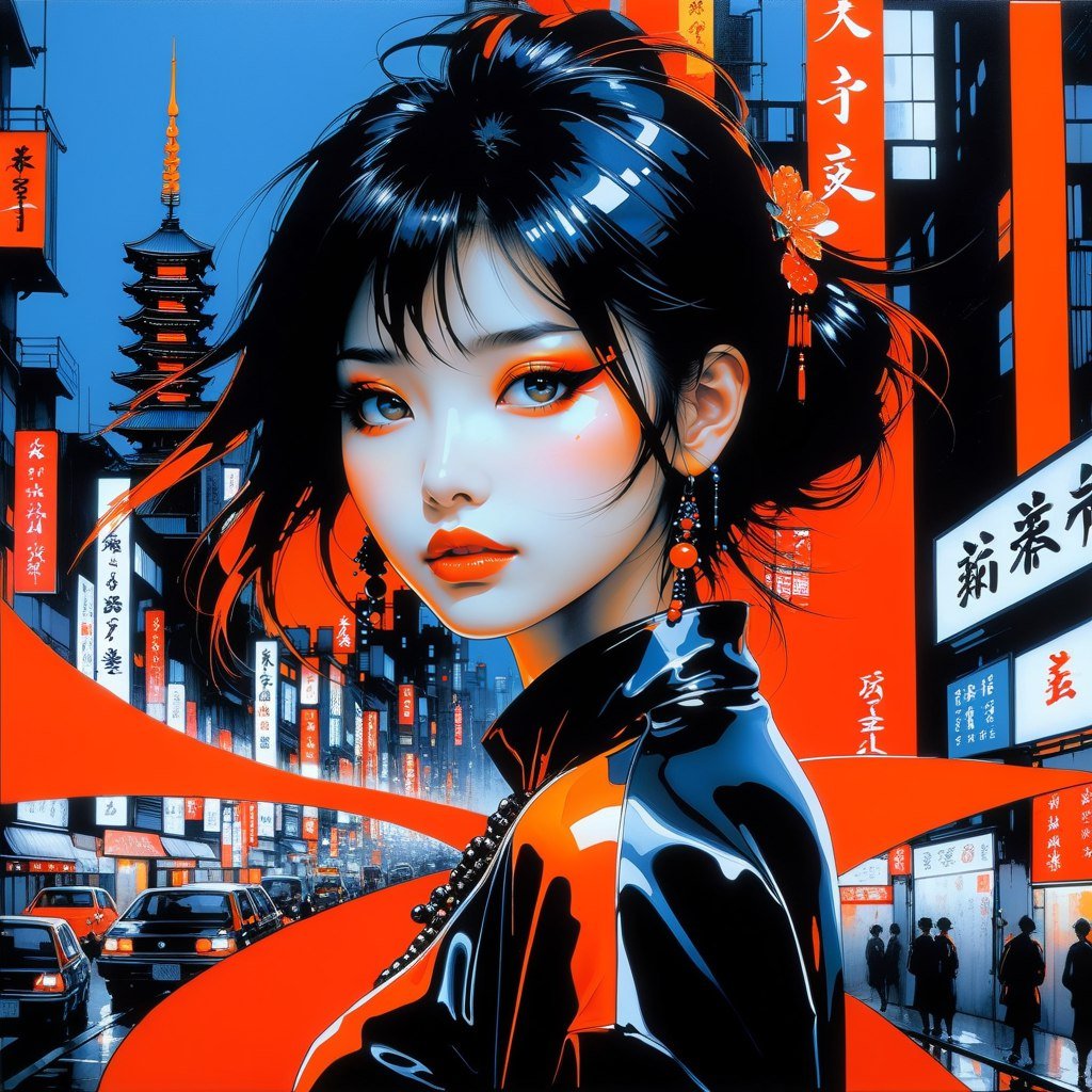 perfect painting, the style of the Japanese artist Yoshitaka Amano. image of a girl-shape posed with hot artistic enamel, classic art, alluring, city background, Bright orange and neon black colours palette, punk vibe, glass mirrored sharp-edged, silhouette.