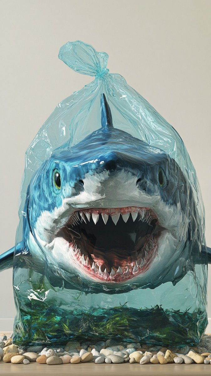 plastic bag with a shark inside, on the living room table, hyperrealistic painting, popular on tumblr, hyperrealism made with the unreal engine 5, 🦩🪐🐞, head in the bag, aquarium in a bag, colored pebbles and algae, scene from a science fiction movie, growling, sofubi, geometrically realistic, Fabry Glenn, photorealism, wonderful scene --ar 9:16 --v 6.1