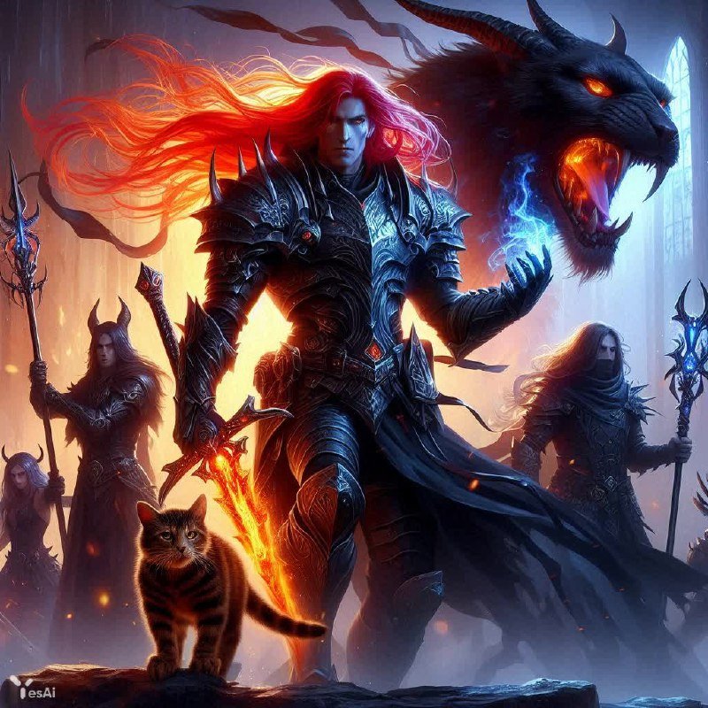 В эпической фэнтезийной сцене гордо предстает отряд могучих воинов, готовых вступить в смертельную схватку. Возглавляет их статная и прекрасная женщина с длинными неоново-красными волосами, облаченная в стильную черную кожаную броню, усиленную серебряными пластинами, и крепко сжимающая в руках двурубный меч, окутанный языками пламени. Рядом с ней стоят три верных соратника: могучий воин с длинными черными волосами, закованный в доспехи с золотыми узорами и вооруженный копье́м; ловкий охотник с саблями и длинными серебряными волосами, скрывающийся под темной синей мантией; и мудрый маг с длинными каштановыми волосами, облаченный в багряный ропот и держащий посох с магическим кристаллом. В их взглядах читается непоколебимая решимость, направленная прямо на зрителя, вызывая ощущение сопричастности к грядущей битве. Рядом с отрядом стоит огромный саблезубый кот с рогами, покрытый черной шерстью и обладающий пронзительными янтарными глазами, рычащий в предвкушении схватки. За ними простирается разрушенное поле боя под бушующим небом, где кружат магические вихри и клубится дым, создавая завораживающую картину, наполненную магическим сиянием. Яркие цвета с акцентами черного, красного и серебряного подчеркивают эпический и героический характер сцены, погружая зрителя в мир гиперреализма и мощи, где каждый персонаж готов сражаться до конца, демонстрируя силу духа и мастерство владения оружием. Общий вид композиции передает атмосферу величия и опасности, приглашая окунуться в захватывающий мир фэнтези