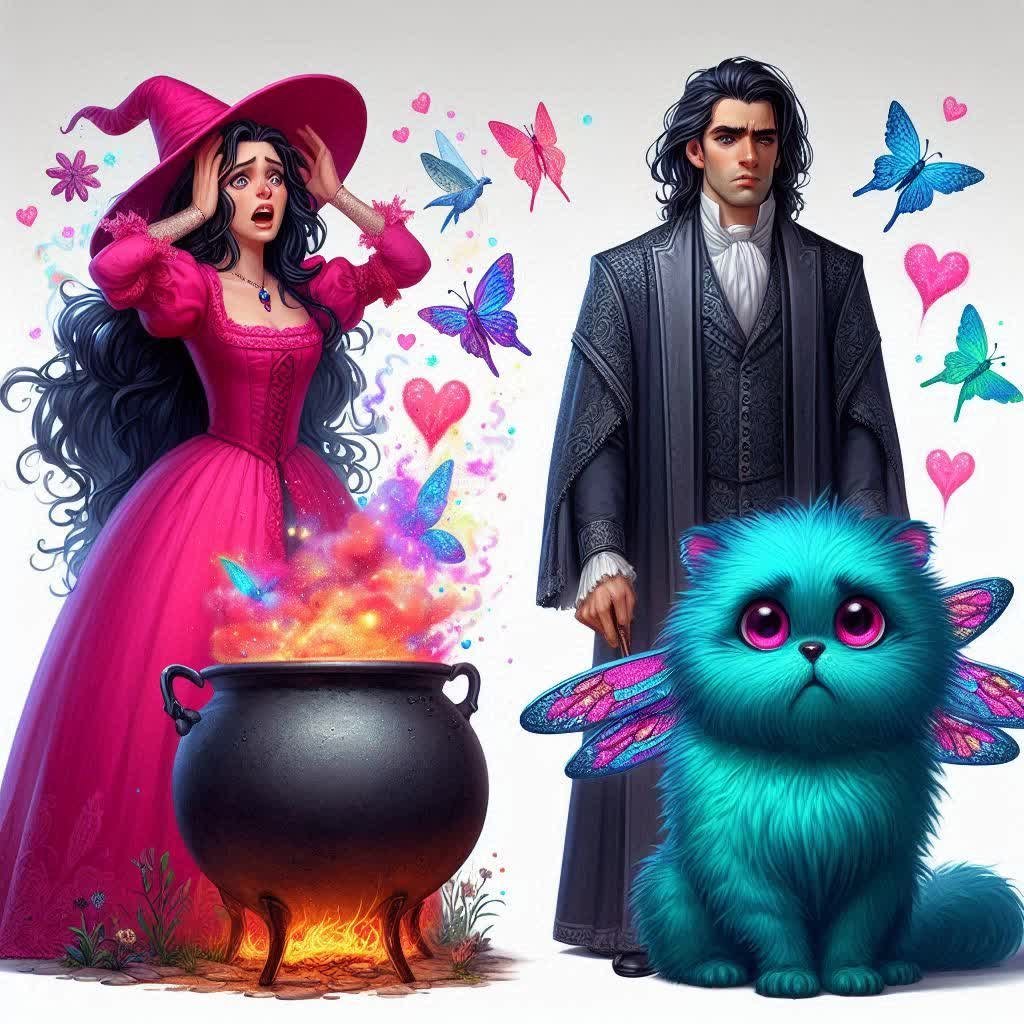 Fantasy. A witch woman with long black hair, in a bright pink dress with a full skirt, stands behind a cauldron, but colorful sparks and smoke in the shape of hearts come out of it. Her face expresses comical despair, looking at the viewer. Next to it is a small fluffy animal that looks like a ground squirrel with dragonfly wings, turquoise fur and large pink eyes. Standing next to him is a handsome, muscular male professor with long black hair, wearing an elegant navy blue robe with silver patterns. His gaze is warm and slightly mocking, looking at the viewer. Background: magic laboratory, bright colors, romantic, naive and humorous atmosphe...