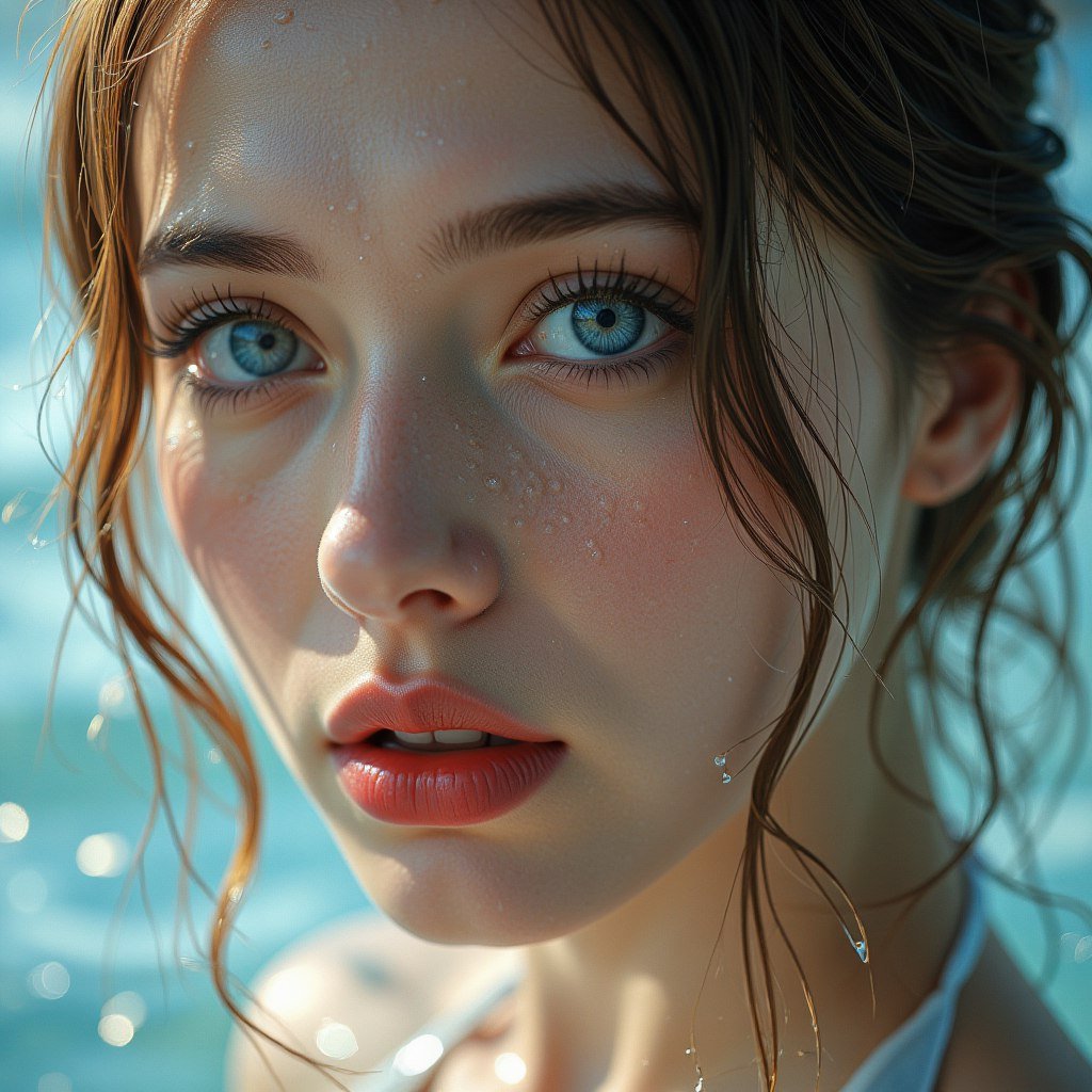 A close-up portrait of a young woman with fair skin, probably in her twenties, with expressive blue eyes. Her face is partially covered with droplets of water that glisten in the light. The woman's expression is sad and pensive, with tears barely visible around her eyes, emphasizing her melancholic mood. Her lips are full and painted a bright red, contrasting with the soft, warm tones of her skin. Her hair, a mixture of light brown and golden tones, is wet and falls around her face. The background is a soft blend of blue and white, reminiscent of an aquatic environment or a stylized image of rain. The lighting is diffused, giving the scene a ...