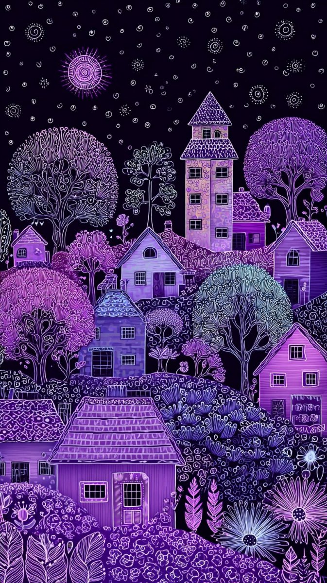 Милое и красочное изображение в стиле наивного искусства, сочетающее элементы цифровой живописи, doodle-стиля и зентангла. Эта очаровательная иллюстрация представляет собой сказочный пейзаж: уютные домики деревни утопают в буйстве цветов и зелени, а тропинка манит вглубь таинственного леса. Небо окрашено в нежные фиолетовые тона, создавая атмосферу волшебной ночи или утренней весны. Рисунок выполнен тонкой линией с акцентом на четкость деталей, что придает ему особую изящность и легкость. Использование пастельных оттенков, таких как белый, добавляет картине воздушности и нежности, а яркие акценты делают ее визуально привлекательной и запоминающейся. Эта иллюстрация идеально подойдет для создания фона в проектах цифрового искусства, оформления веб-сайтов или использования в качестве клипарта. Она передаёт ощущение уюта, тепла и безмятежности, приглашая зрителя окунуться в мир фантазий и волшебства. В изображении гармонично сочетаются элементы фольклорного искусства и мультяшной графики, создавая неповторимый стиль, который будет привлекать внимание любителей милой и доброй иллюстрации. Этот цифровой рисунок станет прекрасным дополнением к любому творческому проекту, добавляя в него нотку сказки и волшебства