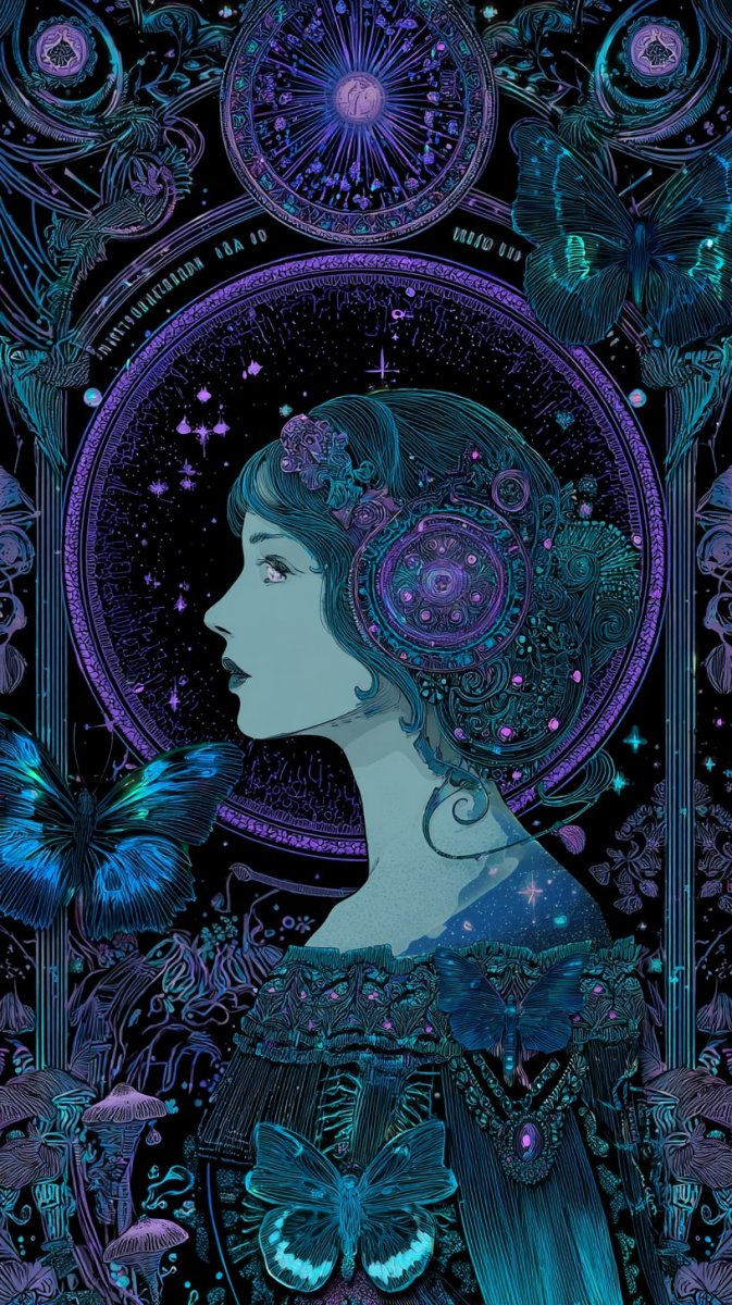 Художественный стиль сочетает готическое настроение с элементами ар-нуво, формируя уникальную эстетику элегантности и мрачности. Детализация изображения поражает: от тонких линий туши до причудливых узоров на крыльях бабочек и замысловатых музыкальных шкатулок – каждый элемент тщательно проработан.
